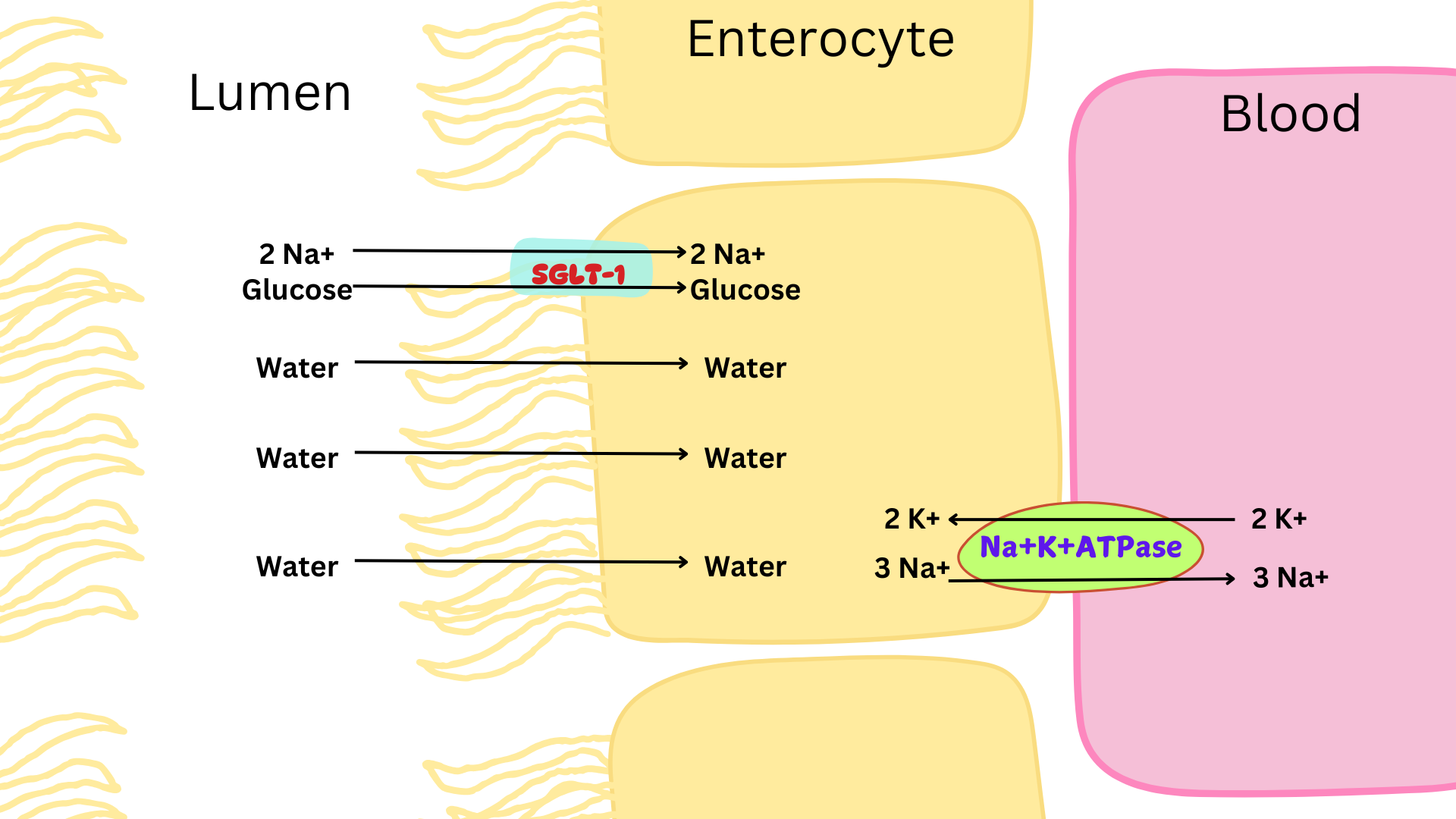 Oral rehydration solution is a combination of glucose and sodium used to treat dehydration (loss of water from body). Presence of glucose aids in the absorption of sodium via SGLT-1. Absorption of sodium is accompanied by absorption of water to maintain osmotic equilibrium. This results in more efficient absorption of water.