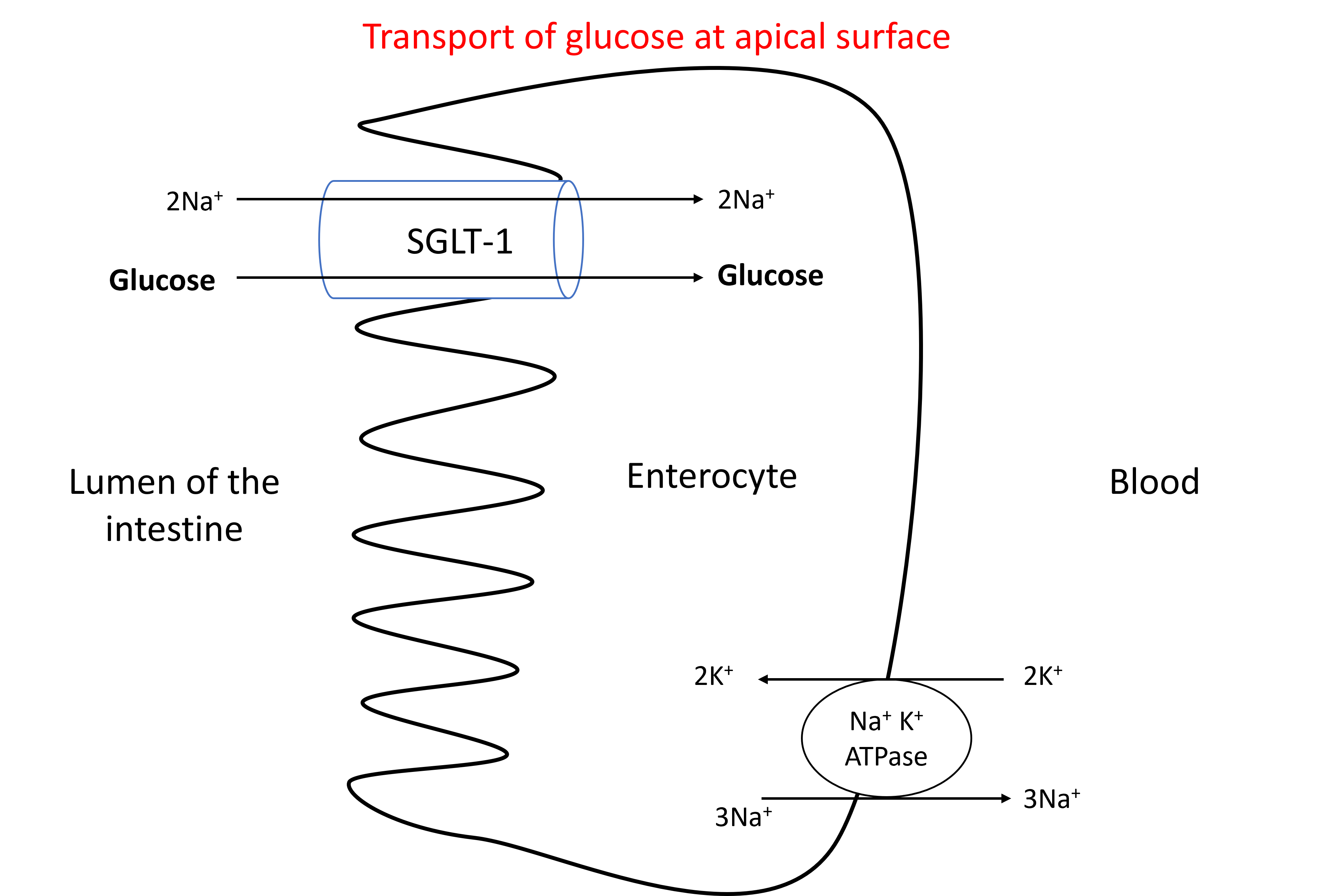 - Absorption of glucose at the apical (luminal) side of the enterocyte is through