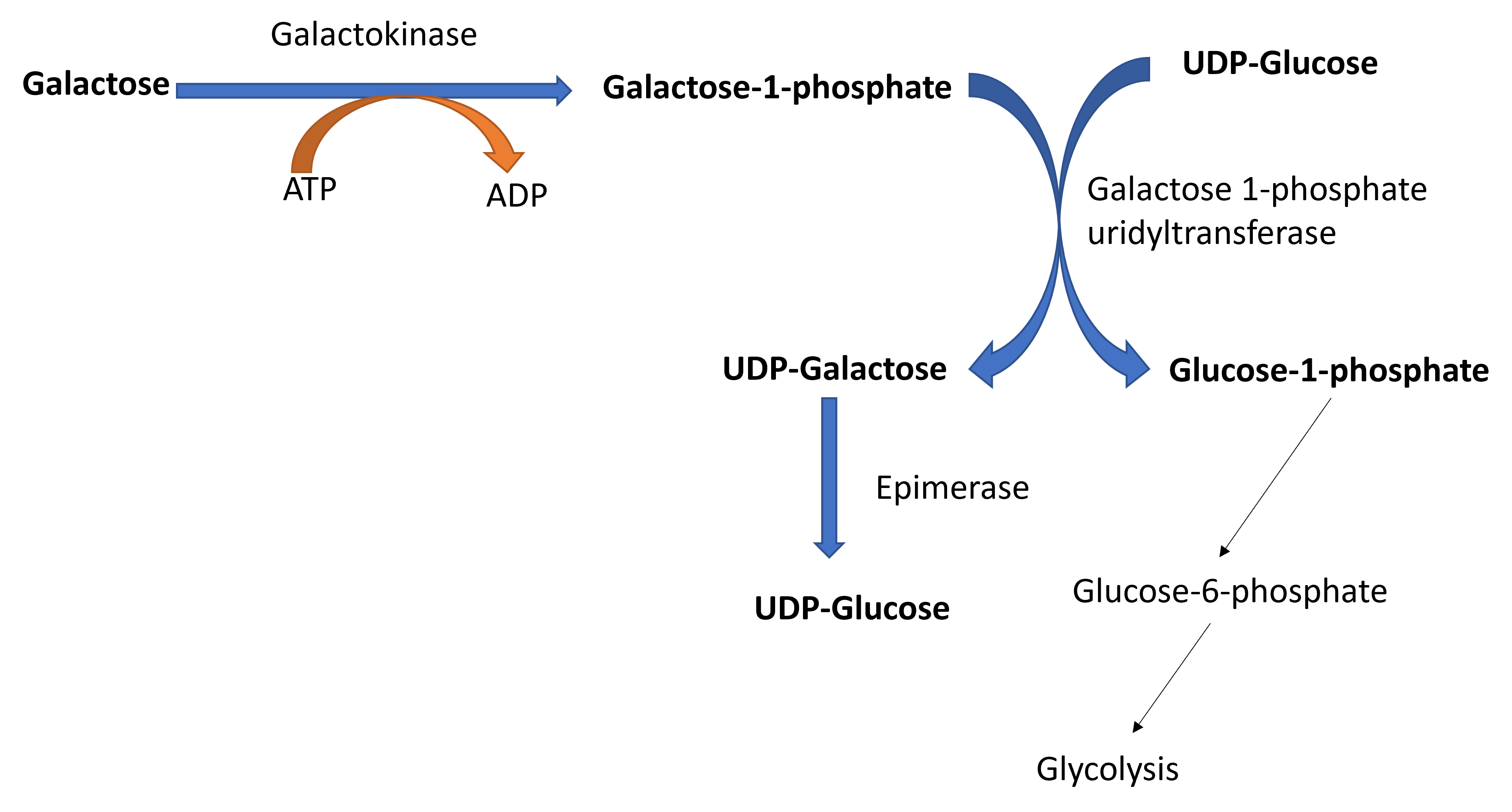 Galactose is utilized as fuel in cells after being converted into glucose. Galactose is synthesized in mammary glands for production of lactose in milk.