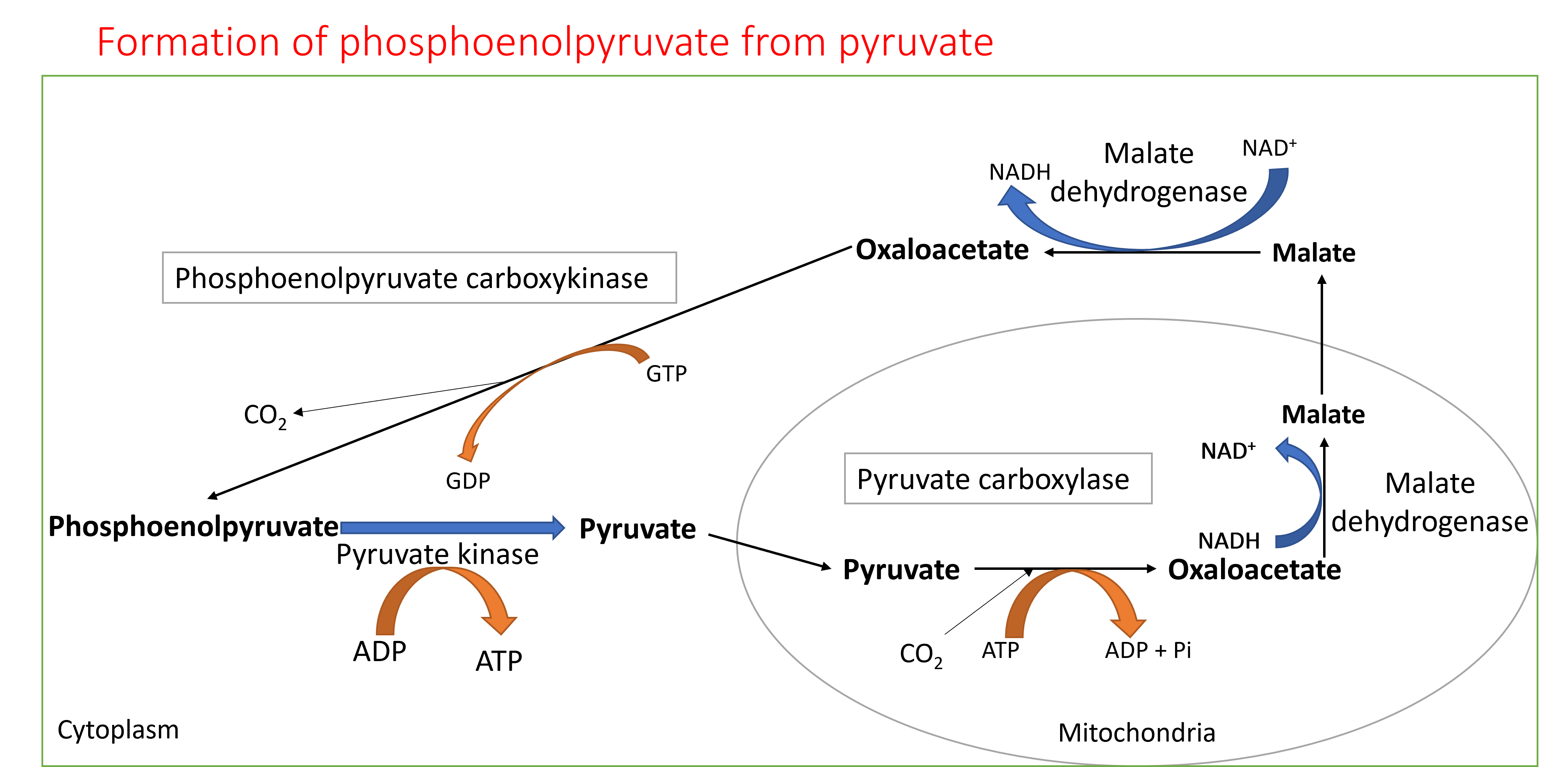 Pyruvate is converted to phosphoenolpyruvate by two reactions. First pyruvate is carboxylated to oxaloacetate in the mitochondria. Oxaloacetate cannot be transported out of mitochondria. It is reduced to malate and malate is transported from mitochondria to cytoplasm. This reaction oxidizes a NADH molecule to NAD+. Malate is oxidized back to oxaloacetate in the cytoplasm which reduces NAD+ to NADH. Oxaloacetate is then converted to phosphoenol pyruvate by decarboxylation. In these reactions, reducing equivalents are effectively transported from mitochondria to cytoplasm which is crucial for gluconeogenesis. These reactions also consume two ATP equivalents per pyruvate to phosphoenolpyruvate generation while the opposite reaction generates only one ATP.
