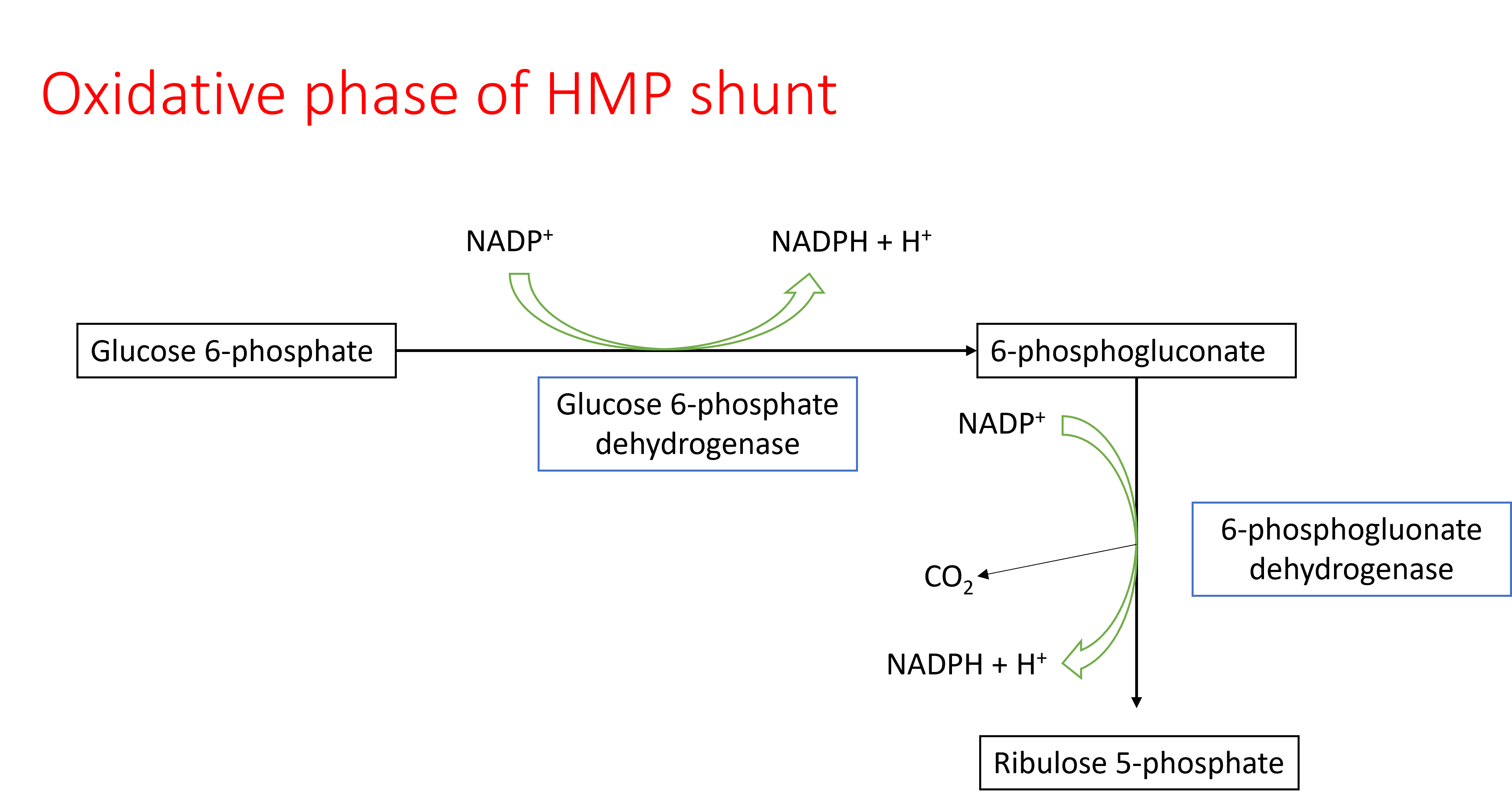 The HMP pathway has an oxidative and a non-oxidative pahase. In the oxidative phase of the pathway, glucose is oxidized to the five carbon Ribulose-5 phosphate with decarboxylation and reduction of two NADP+ to NADPH.
