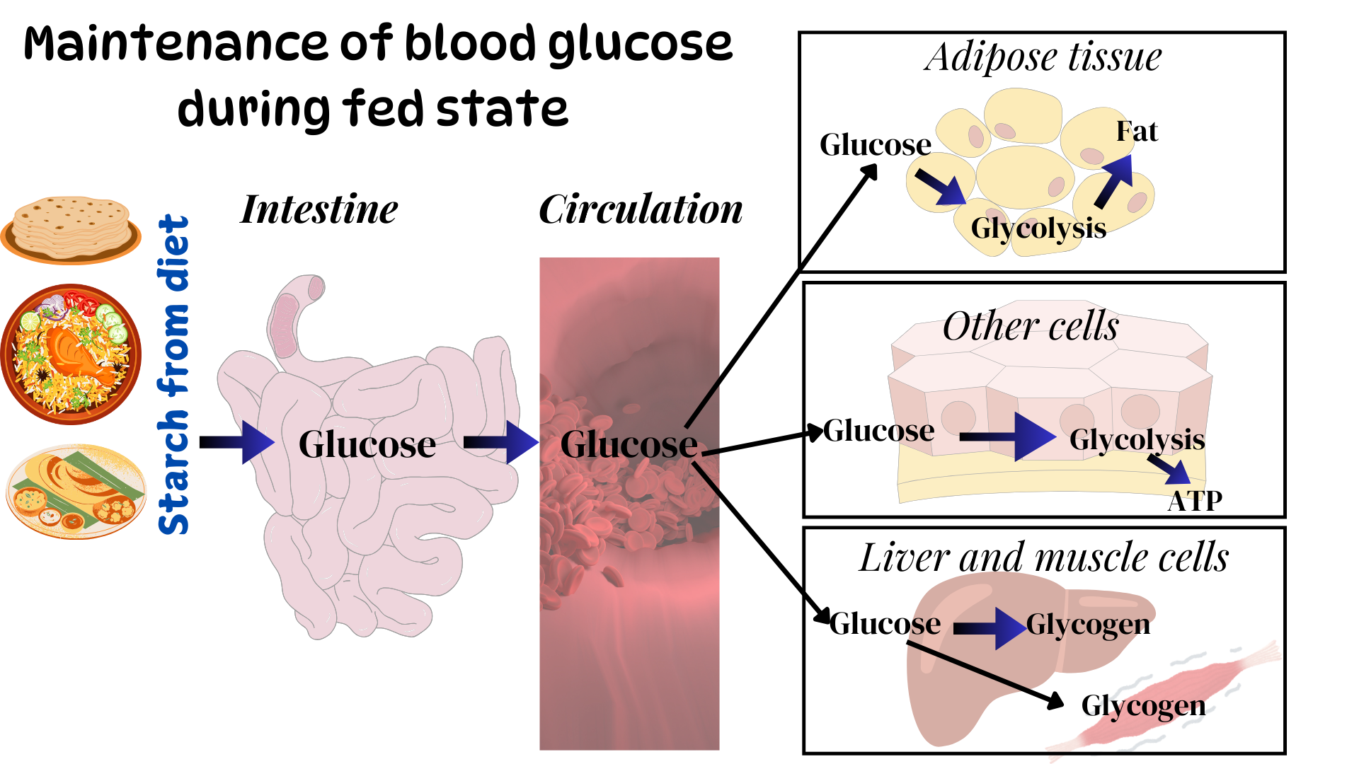 Insulin stimulates glucose utilization and inhibits glucose production resulting in decrease in blood glucose level. Insulin increases uptake of glucose into adipose tissue and muscle through activation of GLUT4 transporters.Insulin stimulates glycolysis and inhibits gluconeogenesis in liver by increasing the levels of Fructose-2,6 bisphosphate. Insulin inactivates glycogen phosphorylase and activates glycogen sythase through covalent modifications resulting in activation of glyocgenesis and inhibition of glycogenolysis in liver and muscle. Insulin also promotes the conversion of glucose to fat in adipose tissue.